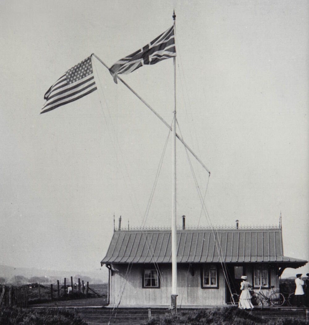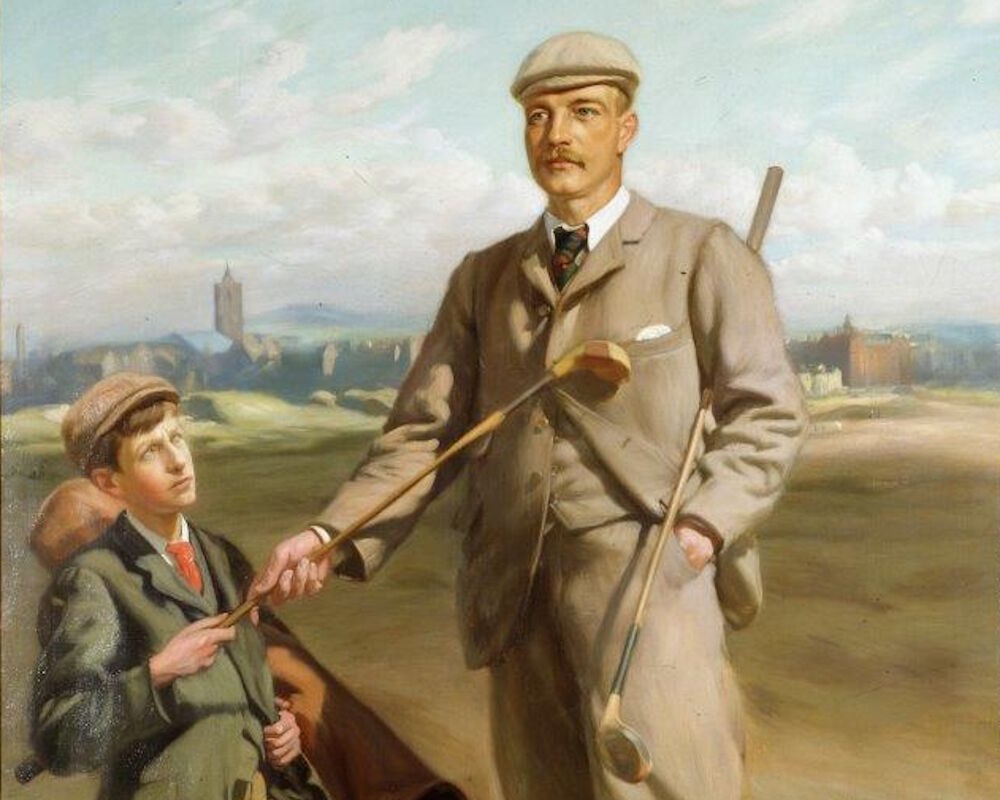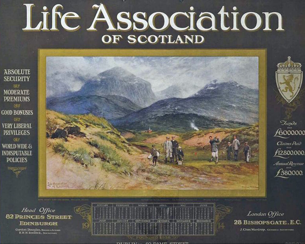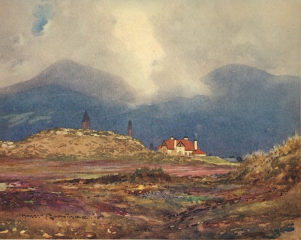 In April 1908 King Edward VII conferred royal patronage on the club. In December that year the President of the Club, Hugh, 5th Earl Annesley, who had been a generous benefactor of the Club, died. His son, Francis, succeeded his father and was immediately elected President of Royal County Down. He was an excellent golfer who had won the South of Ireland Golf Championship in 1906 and after he became President he contributed enormously to the life of the Club. In 1913 the Life Association of Scotland commissioned the Scottish artist Michael Brown to paint a golf scene at Royal County Down to use in their annual calendar. Brown’s original painting included Francis with three other golfers and hangs in the members’ area of the clubhouse. One of those golfers was Lionel Munn, the leading Irish amateur of that era and coincidentally Francis lost to him in the final of the Irish Amateur Championship in August 1914. Tragically, in November that year, Francis lost his life when his airplane was shot down by German gunners over the Belgian coast. Thereafter the club never elected another President.