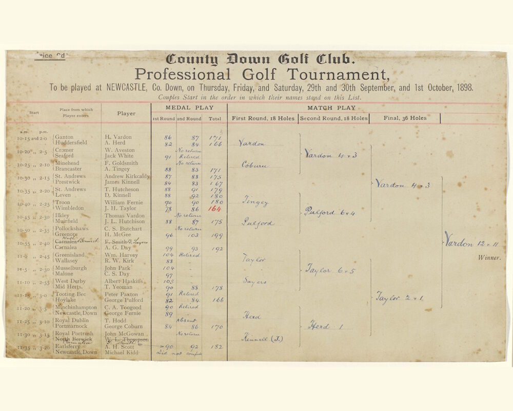 The Irish Professional Tournament returned to Newcastle in 1898. Harry Vardon had just won The Open for the second time a few weeks earlier. His biography subsequently noted that by 1898 he was fast establishing his superiority over his rivals 'who could only stand and watch in admiration' at his progress through the tournament and the demolition of JH Taylor by 12 & 11 in the final. Vardon’s score of 71 strokes in the morning round of the final was recorded in detail by George Combe, the match referee, and declared a new record, beating the previous record of 74 set by Alex Herd two years earlier. Taylor was quoted after the match: 'I played my game but who could stand against that?'