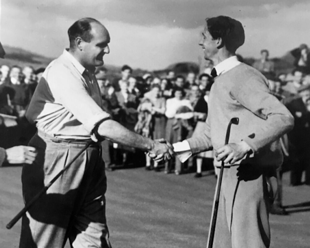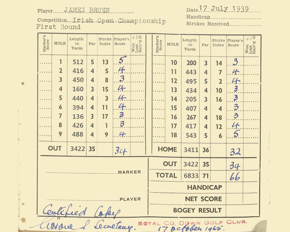 English dominance of the Irish Open continued at Royal County Down in 1939 when Yorkshireman Arthur Lees won against a high quality field including Bobby Locke from South Africa, Max Faulkner and Fred Daly. Lees went on to play in four Ryder Cups and was the club Professional at Sunningdale for almost thirty years while still competing successfully. Ireland’s 19-year-old Walker Cup player, Belfast-born Jimmy Bruen, opened with a course record score of 66 and remained in contention until a final round 81 saw him slip to sixth place, nine strokes behind the winner. He went on to win The Amateur Championship in 1946 at Royal Birkdale and played in two more Walker Cups before a wrist injury ended his competitive career.